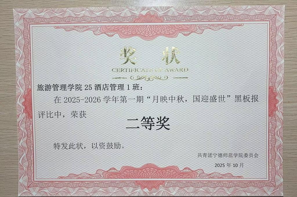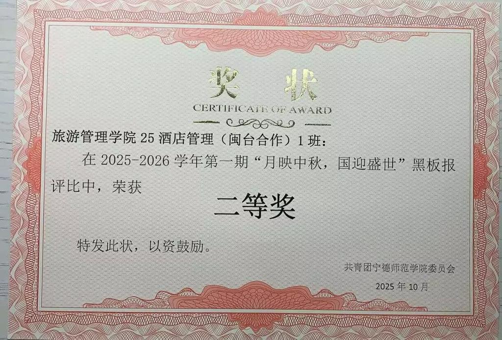 月满中秋迎华诞,情暖校园绘初心。为传承中华优秀传统文化,学校开展了“月映中秋,国迎盛世”黑板报评比活动。旅游管理学院学子积极响应,以板为媒、以笔抒怀,将双节的团圆意蕴、盛世气象与青春创意深度融合,打造出一批独具匠心的作品。此次评比活动中,25酒店管理1班、25酒店管理(闽台合作)1班凭借鲜明的主题、精美的排版荣获二等奖,用实力彰显了旅管院学子的文化风采与集体智慧。