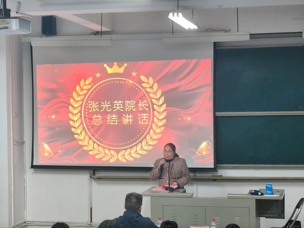 随后,旅游管理学院党委书记、院长张光英教授作总结表彰讲话。张院长对本次运动会的组织与参赛情况进行了全面回顾和高度评价,充分肯定了运动员们在赛场上顽强拼搏、奋勇争先的精神风貌。他指出,同学们用实际行动生动诠释了“更高、更快、更强——更团结”的奥林匹克精神,为学院赢得了荣誉,展现了旅管学子的良好形象。同时,张院长代表学院向在幕后默默付出的裁判员、志愿者和全体后勤保障人员致以衷心感谢,正是他们的辛勤工作和无私奉献,保障了运动会安全有序、精彩纷呈。