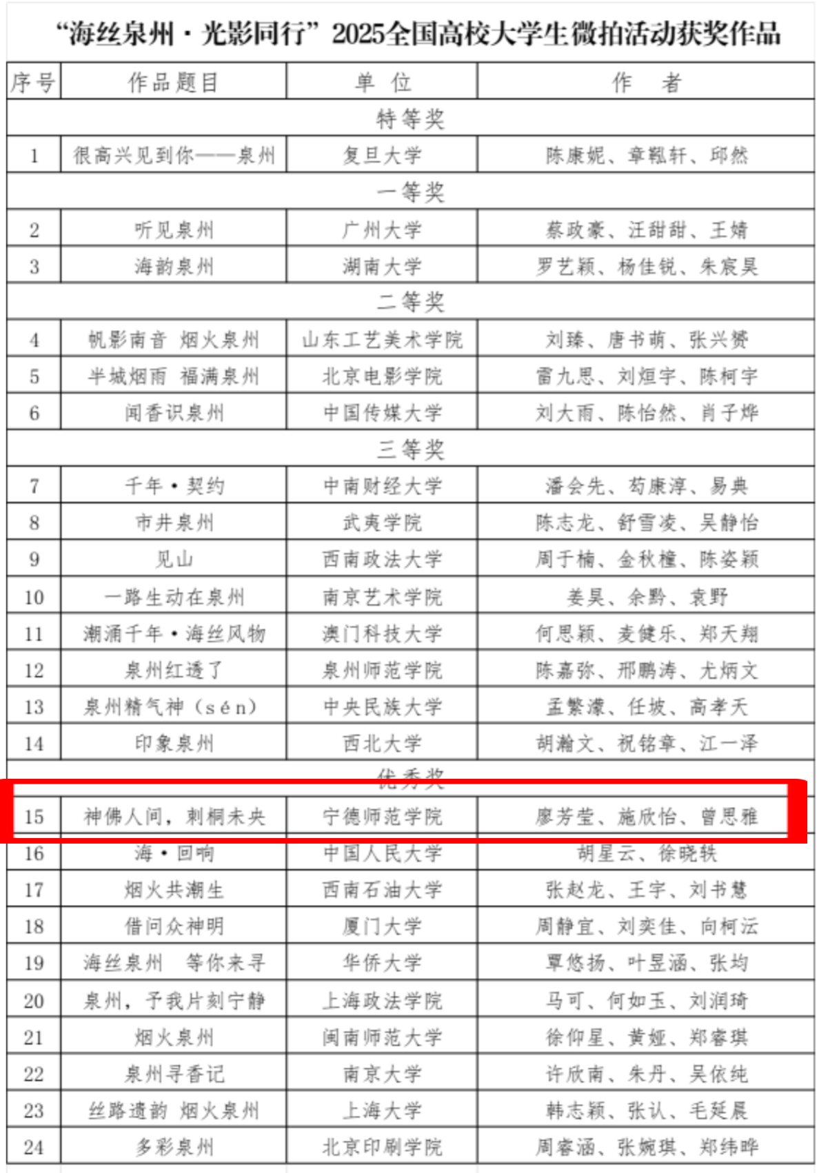 2025年11月3日,泉州市文化广电和旅游局正式公示“海丝泉州·光影同行”2025年全国高校大学生微拍活动获奖名单,宁德师范学院旅游管理学院选派的学生团队凭借作品《神佛人间,刺桐未央》荣获优秀奖。这一成绩不仅彰显了学院在文旅融合人才培养中的创新实践,更以青年视角为海丝文化传承注入鲜活力量。