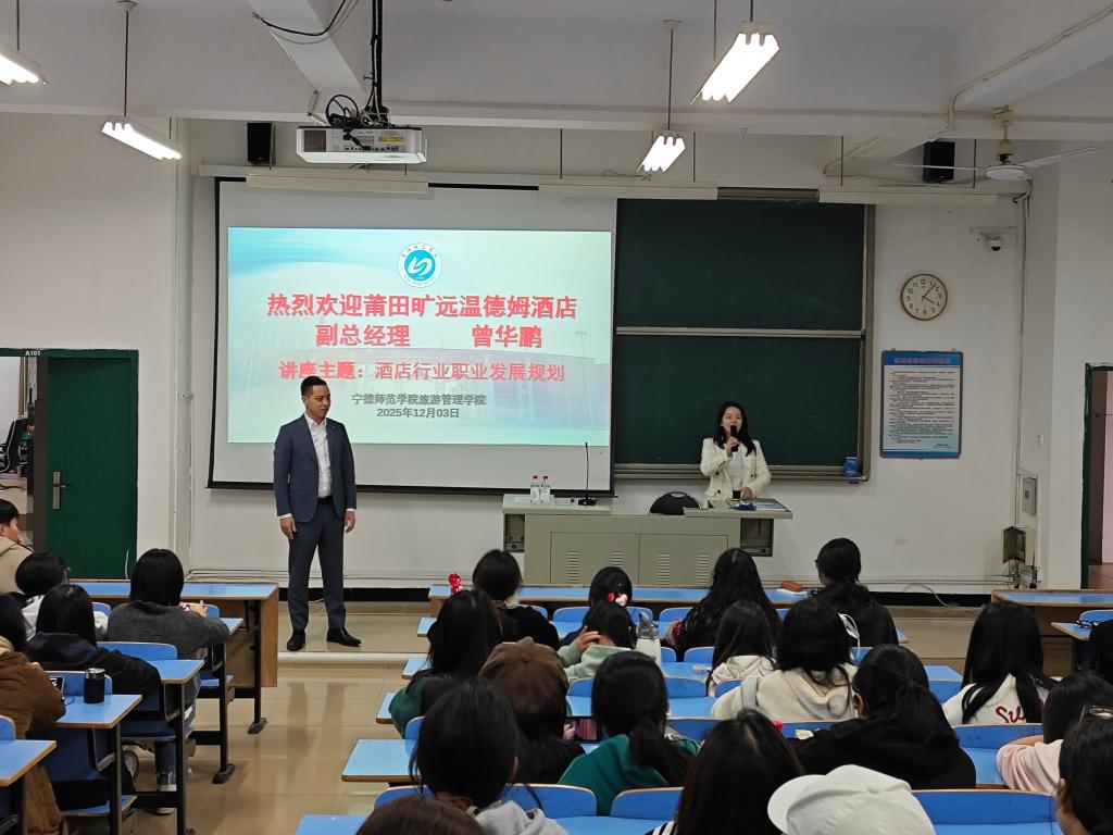 为帮助25级酒店专业新生明晰职业发展路径,搭建校园与行业的沟通桥梁,12月3日下午4:10,旅游管理学院于BA101教室成功举办“温暖宁师”系列活动--解密酒店职场进阶密码。本次讲座特邀莆田旷远温德姆酒店副总经理曾华鹏主讲,曾华鹏2014年毕业生宁德师范学院酒店管理专业,是旅游管理学院杰出校友,现担任学院校外实践导师。25级酒店专业全体学生到场聆听,现场氛围热烈融洽。